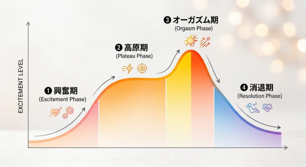 興奮期で性的興奮が高まり、いよいよオーガズム(絶頂)の一歩手前までピークに達して、その高い興奮状態を維持しているのが【❷高原期(プラトー期)】です📈