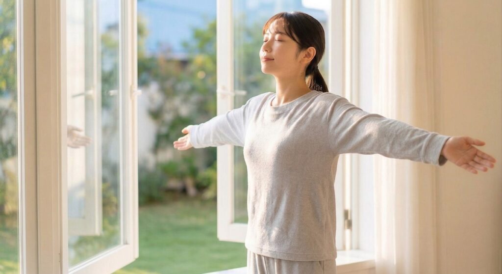 朝、太陽の光を浴びながら下腹部を意識した深い呼吸を数回行ってください。日光を浴びることでセロトニンが分泌され、それが夜間の質の高い睡眠に必要なメラトニンへと変化します。交感神経と副交感神経の切り替えをスムーズにし、リラックスした状態で感覚を受け取るための神経系のベースを整えることで、性感の感度もグッと高まります